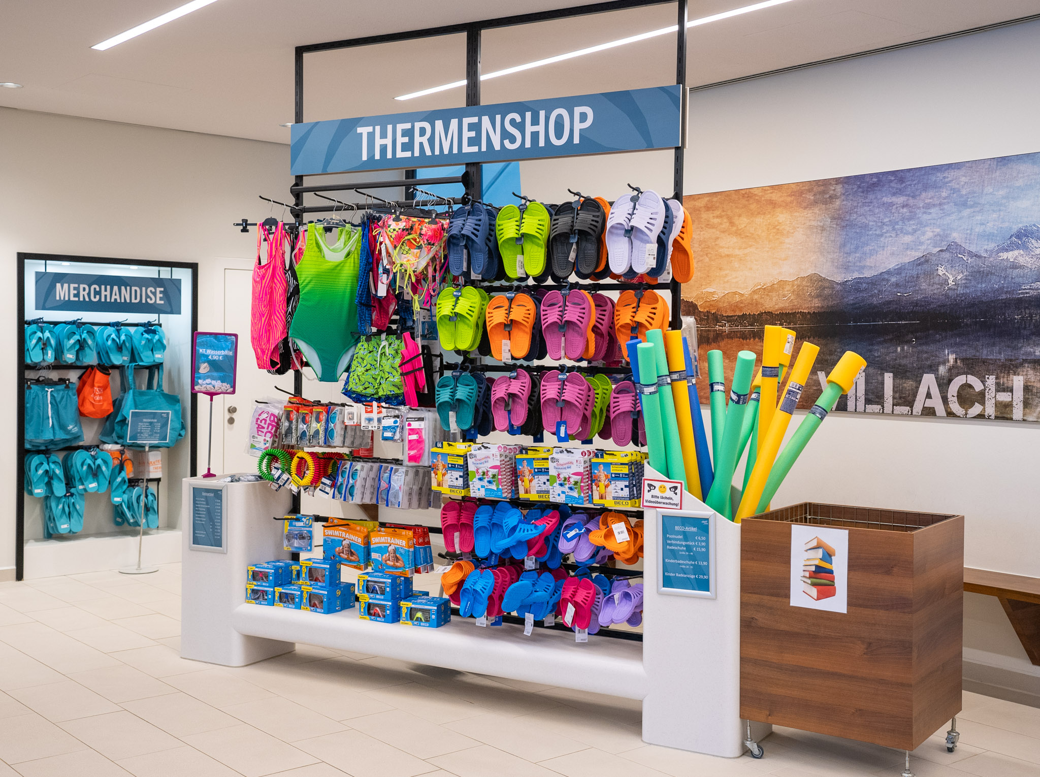 Im Eingangsbereich der Kärnten Therme finden Sie unseren Thermenshop mit einer großen Auswahl an Bade-, Fitness- und Sportbekleidung sowie verschiedenen Freizeitartikeln.